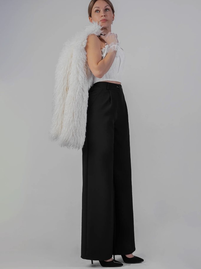 Эластичные женские брюки палаццо выполнены из плотной ткани экокожи. Брюки с высокой посадкой, что отлично подчеркивает фигуру и делает её идеальной.